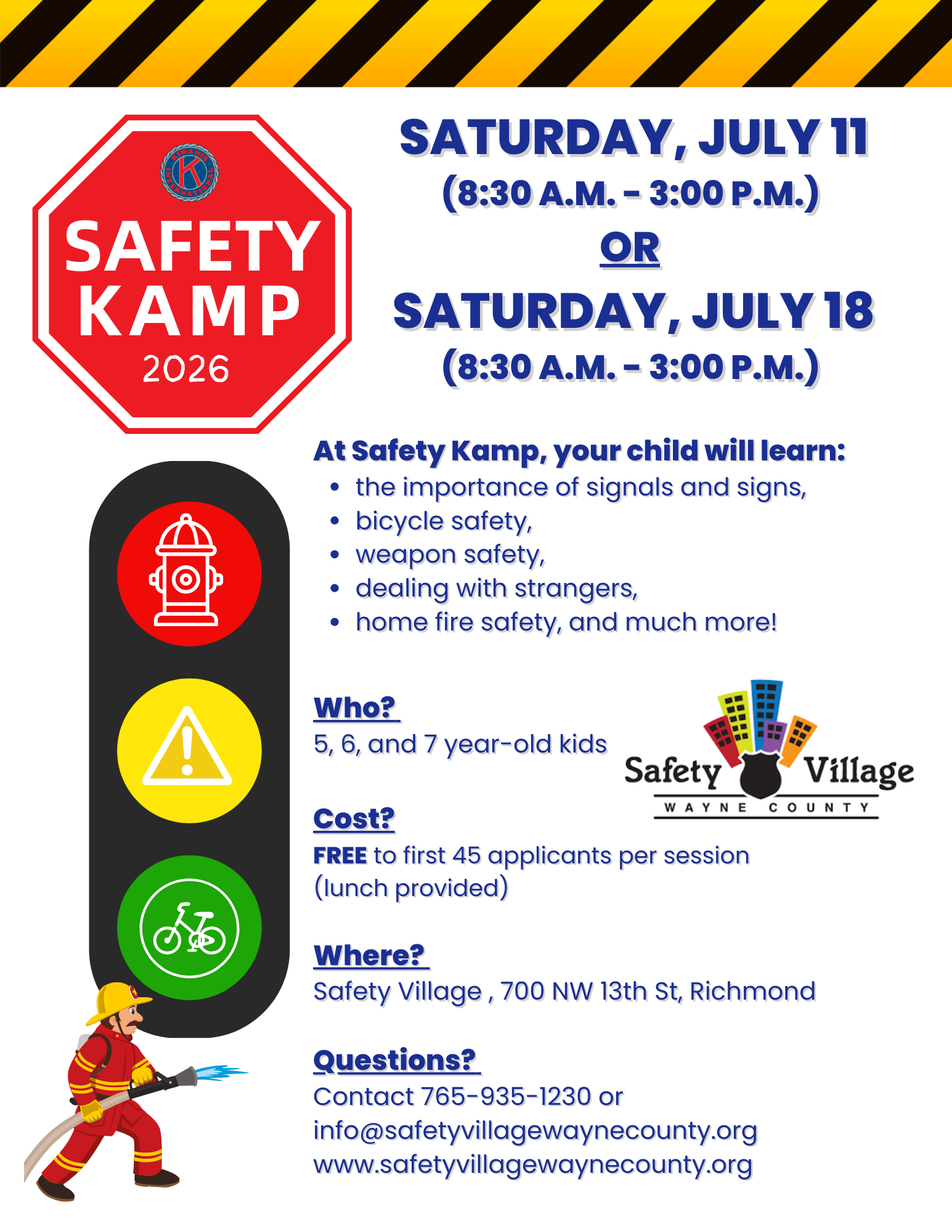 Each summer in Safety Kamp kids learn about street safety, bicycle safety, poison control and fire prevention. Cooperation of Richmond Fire Department, Richmond Police Department and Wayne County Sheriff's Department and countless volunteers promote safety in various ways to Kamp attendees.
